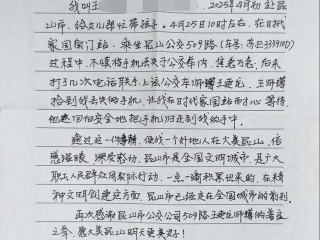 4月30日,公交五分体育中心车队收到了一封表扬信,乘客王先生感谢公交W509路驾驶员王建龙师傅拾金不昧。