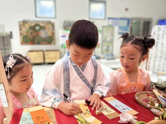 朝阳幼儿园的小朋友们踏过清香艾草,体验“驱邪祈福”的端午习俗;点朱砂、沐兰汤,感受传统仪式的美好寓意;挥笔共画“福”字,将童真与祝福融入笔墨之间。丰富多彩的活动不仅让孩子们领略了中华文化的魅力,更在欢声笑语中收获了双倍的节日喜悦。