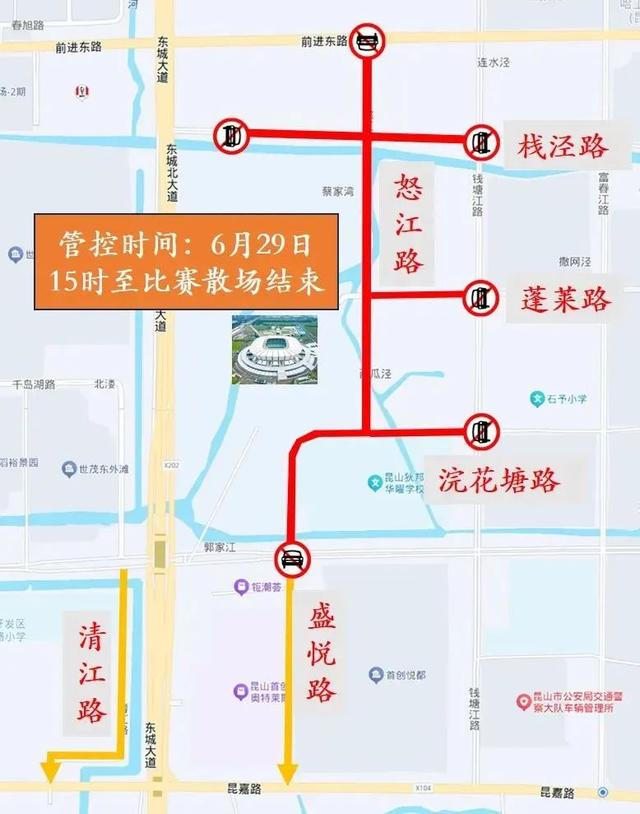 2025江苏银行江苏省城市足球联赛(苏州赛区)第五轮苏州对战扬州的比赛将于2025年6月29日(周日)19时在昆山奥体中心举行,为确保赛事期间道路交通安全畅通,根据《中华人民共和国道路交通安全法》及《中华人民共和国道路交通安全法实施条例》的有关规定,决定对相关道路实施临时交通管控,除比赛保障车辆和公交车外的其他车辆限制通行。