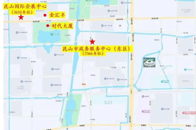 昆山国际会展中心、金汇丰、时代大厦(合计3610个车位)、昆山市政务服务中心(东区)停车场(2366个车位)【以上停车场配套免费公交专线】。