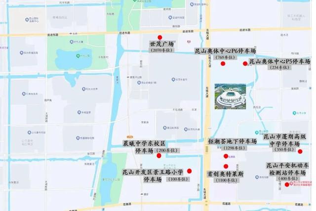 世茂广场停车场(2070个车位)、奥体中心P5停车场(234个车位)、奥体中心P6停车场(769个车位)、钜潮荟停车场(1298个车位)、首创奥特莱斯停车场(1100个车位)、晨曦中学东校区停车场(200个车位)、蓬朗高级中学停车场(350个车位)、昆山开发区景王路小学停车场(100个车位)、平安机动车检测站停车场(400个车位)。