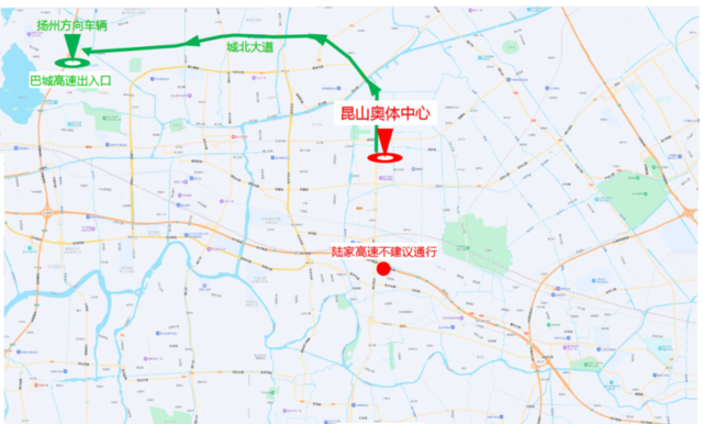 前往扬州方向:请向北从城北大道绕行至常嘉高速巴城收费站。