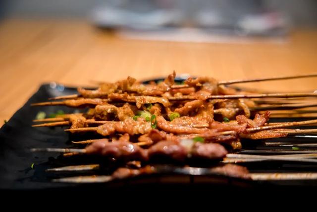 点一盘个大、味足的羊肉串,肥瘦相间连着筋,顺着签子一口撸下,孜然、辣椒粉与羊油的熏烤香气在舌尖炸裂,嘎嘎香。