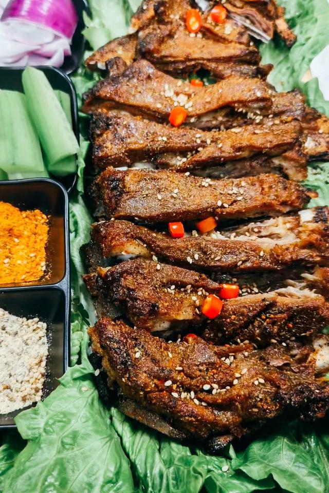 羊排界的“天花板”,看这里!招牌的厚切羊排,由独家调味腌制而成,孜然、辣椒粉和小米椒均匀地洒在表面,金黄微焦,奶香四溢不腥膻,配上黄瓜条、洋葱片,一口下去根本停不下来。