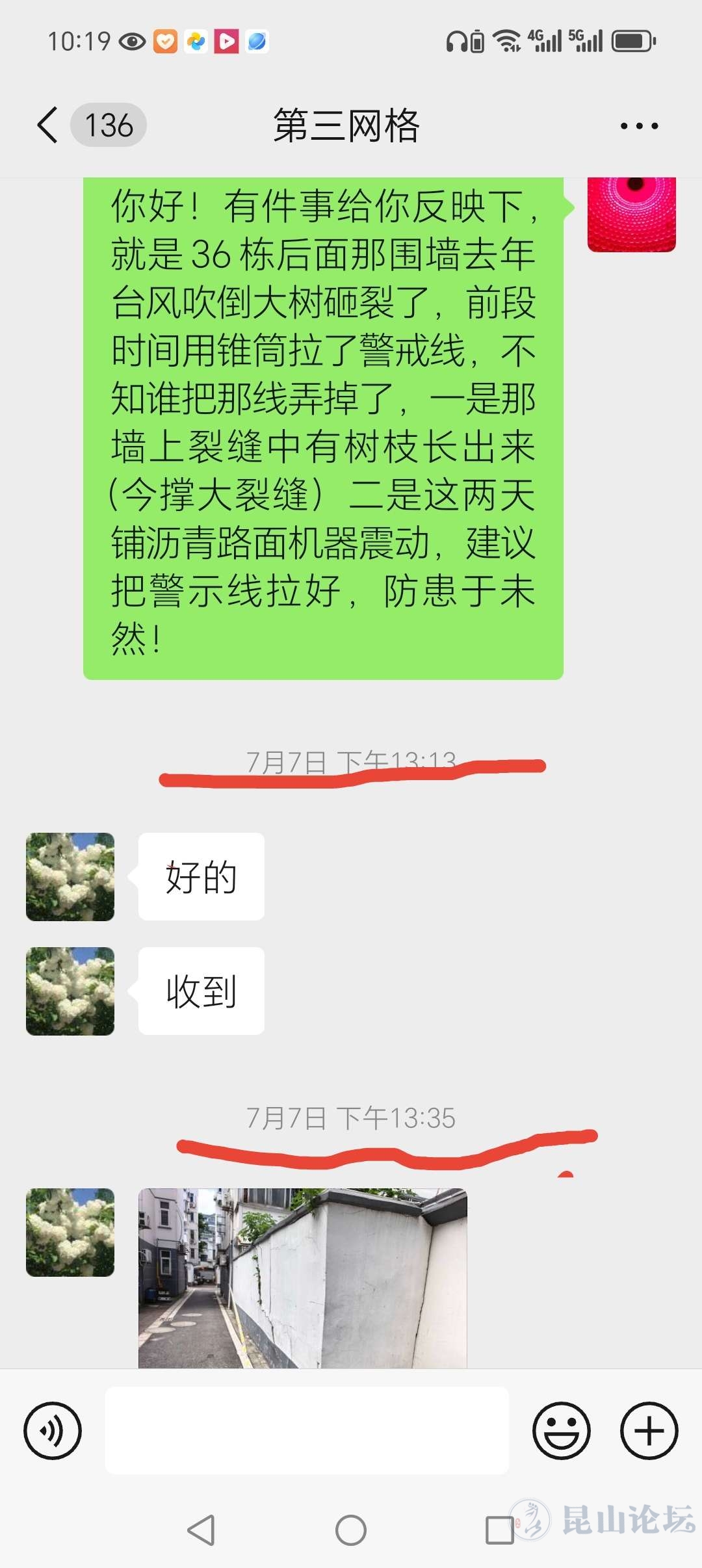 事情的经过是去年台风的大风吹倒小区一棵四,五十公分粗的大树,树杆砸裂了车库和楼栋通道的围墙,今年又有院内枸树从裂缝长出来(撑开裂缝更大)第三网格巡查发现后用锥桶和化纤打包绳拉起了警戒线,提醒危墙勿靠近!7月7日上午11的我路过看到警戒线的绳子不知被谁弄断不见了,暑假期间,小孩也多,加之院内補铺沥青路面压路机器震动,造成不安全隐患。我便将此事微信反映给第三网格,两小时内问题得到解决,工作人员警用警戒线的胶带重新拉上了警戒线。并在微信上给我回复了处理结果,并附有照片。这种重视群众意见,处理问题的速度,事后反馈处理问题的结果让人感动!
