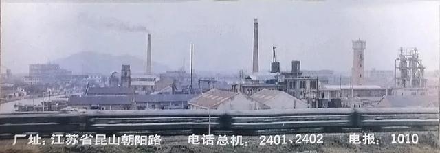 下面图片是,建造于上世纪60年代,昆山县最大的国营化工厂,市民称叫“小西门化工厂”。可看到昆山化工厂的两个高大耸立的烟囱管,一个烟囱管上面正飘着浓烟,从烟雾的飘向可看出拍照的那一天,天空正飘着东南风。沪宁铁路上的火车从厂区飞驰而过。照片上远处的昆山地标马鞍山清晰可见。