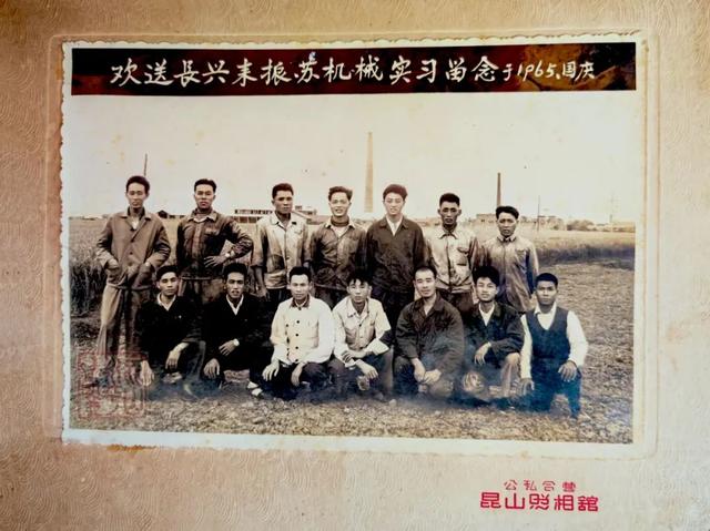 下面照片是1965年国庆节,欢送长兴来振苏机械厂实习人员,在昆山振苏砖瓦厂外景合影的留念。在照片的背景上,可一目了然清晰地看到,厂区高耸林立的烟囱管。照片由公私合营的昆山照相馆拍摄。