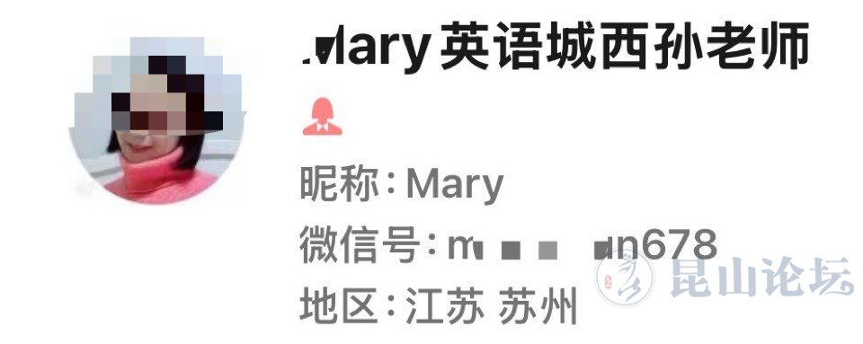 曝光活跃在 巴城镇的 不良教培英语老师 孙xx ,此人女,号称三十年教学经验退休老师,东北人,五十多岁。上门家教,提前收取家长12次课时费 4000多,上了5次后家长感觉跟她沟通不畅,教学水平也不太好,就不想继续上,要求退掉剩余7次课费用,现在已经一周多了,钱也不退,让她把剩余课上完,发信息也不回,出尔反尔,人品极差。她说她在巴城还有带走四位学生英语一对一,现在论坛曝光此人两个微信号,大家小心此人! 大家可以提提意见如何整治此人不良行为!