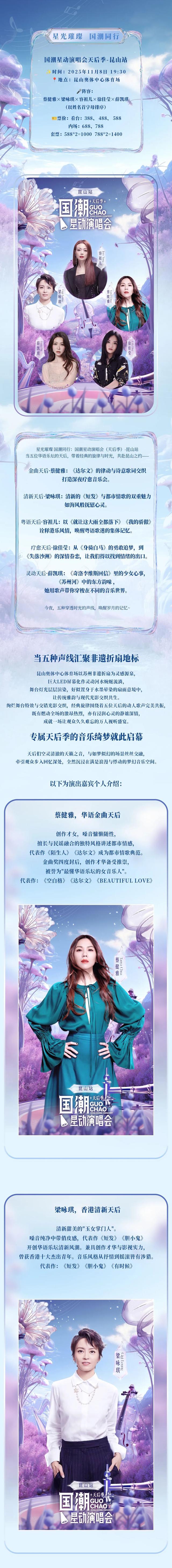 11月8日,“国潮星动演唱会天后季——昆山站”将在昆山奥体中心盛大启幕。蔡健雅、梁咏琪、容祖儿、徐佳莹、薛凯琪等5位华语乐坛标志性的“天后”,将携各自经典之作齐聚昆山,以5种截然不同却同样深入人心的声线,唤醒众多听众的集体记忆,共赴一场与时光缠绵的音乐之约。