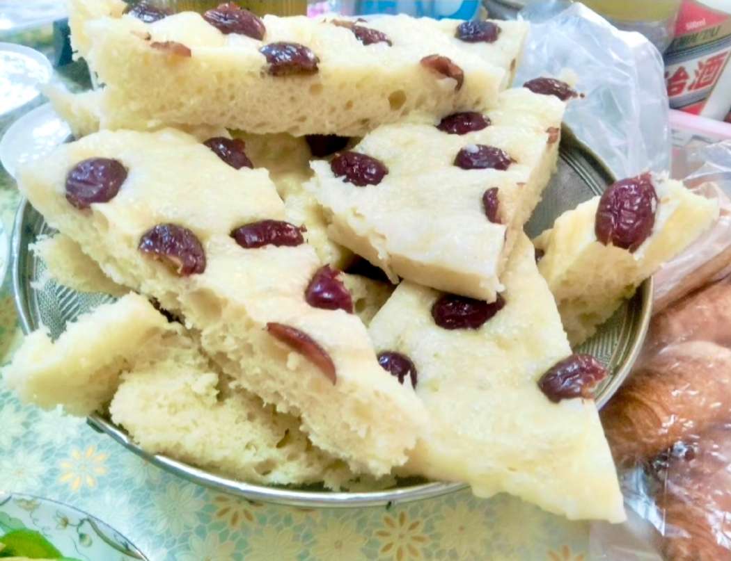 这个发糕是南通地区的一种经典面食,其特点是不用酵母发面,而是用老酵发面的,蒸出来的发糕气孔很大,非常松软,因为是老酵发面,吃上去有股浓烈的酒香味,和我们平时吃的馒头大不一样。五十年前父亲怕我暑假在城里闯祸,就让大院里一个同一老家的大哥哥带了回去,在镇上看到有卖这个发糕的,发糕弥漫的香味让我们驻足,大哥哥买了一大块和我分了吃了,太大了,怎么都吃不完,那时候粮食是很宝贵的,不能浪费,我就想带到乡下给猪吃,晚上到了奶奶家,我把发糕拿出来,说吃不下了,带给猪吃的,结果说话间,掉了没几颗牙的奶奶嚼巴嚼巴吃完了,还意犹未尽的样子。