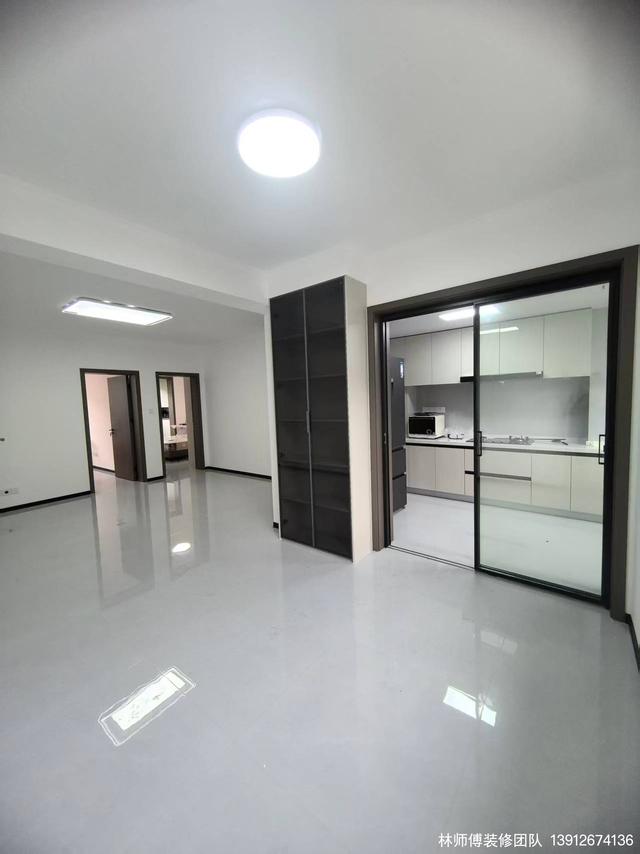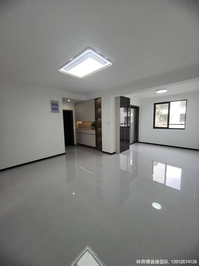 客厅以 “灰色地面 + 白色墙面” 的经典搭配奠定清爽基调,800×800mm 浅灰色地砖通铺,与白色环保乳胶漆墙面形成冷暖平衡,让空间显得格外开阔。目前家具暂未进场,但这种 “留白设计” 恰好凸显了空间的通透本质,为后续软装搭配预留了充足发挥空间。