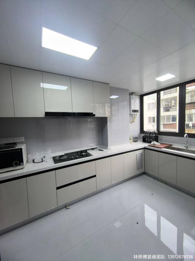 作为家庭 “烟火中心”,厨房采用L 型动线设计,将洗菜、切菜、烹饪区域沿墙面自然划分,操作转身即可完成,极大提升下厨效率。上下两排橱柜增加厨房收纳能力,吊柜到顶避免积灰死角,地柜预留消毒柜与洗碗机位置,满足现代家庭需求。