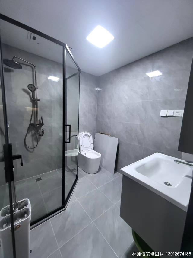 卫生间采用 灰色系瓷砖通铺,耐脏且易清洁,从视觉上缩小空间压迫感。核心设计是钻石型淋浴房,利用墙角斜向布局,比传统方形淋浴房节省空间。更难得的是,淋浴房、马桶、吊顶、浴霸等全包含在 9 万预算内,真正实现 “所见即所得”。