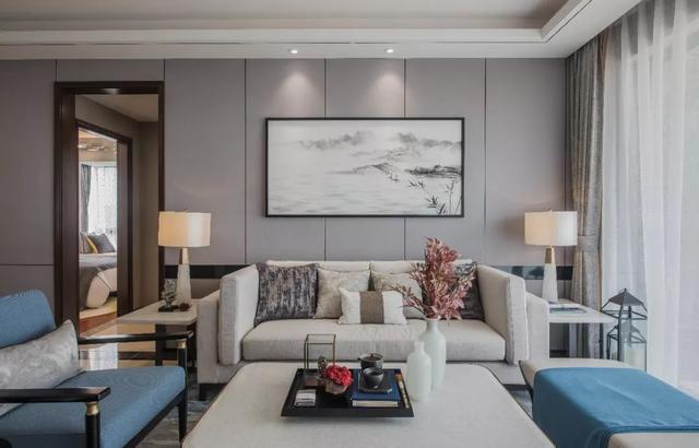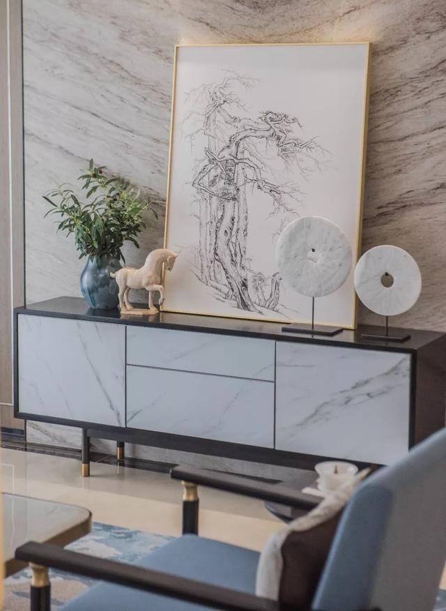 客厅饰以“天地间·竹叶漫舟”及“山水间·惬意林立”挂画等装饰元素,搭配简约利落的家具,使中式风格与现代风格相互糅合,呈现出富有禅意而不落俗套的雅致招待空间,在强调主人文化品味及自身修养的同时,更不失生活原本的舒适性。