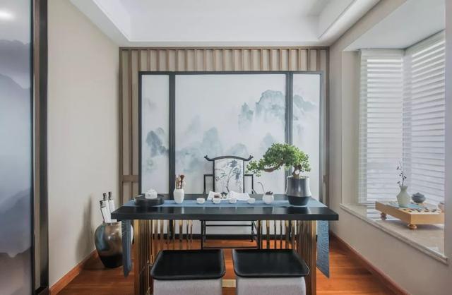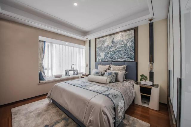 卧室设计上,将自然山水的景色引入空间,在现代生活的环境中结合东方美学底蕴,意在“一卷代山、一勺代水”,令空间居住者自然代入“物象因视觉成景,景因心悟而成境”的无相、万象空间。