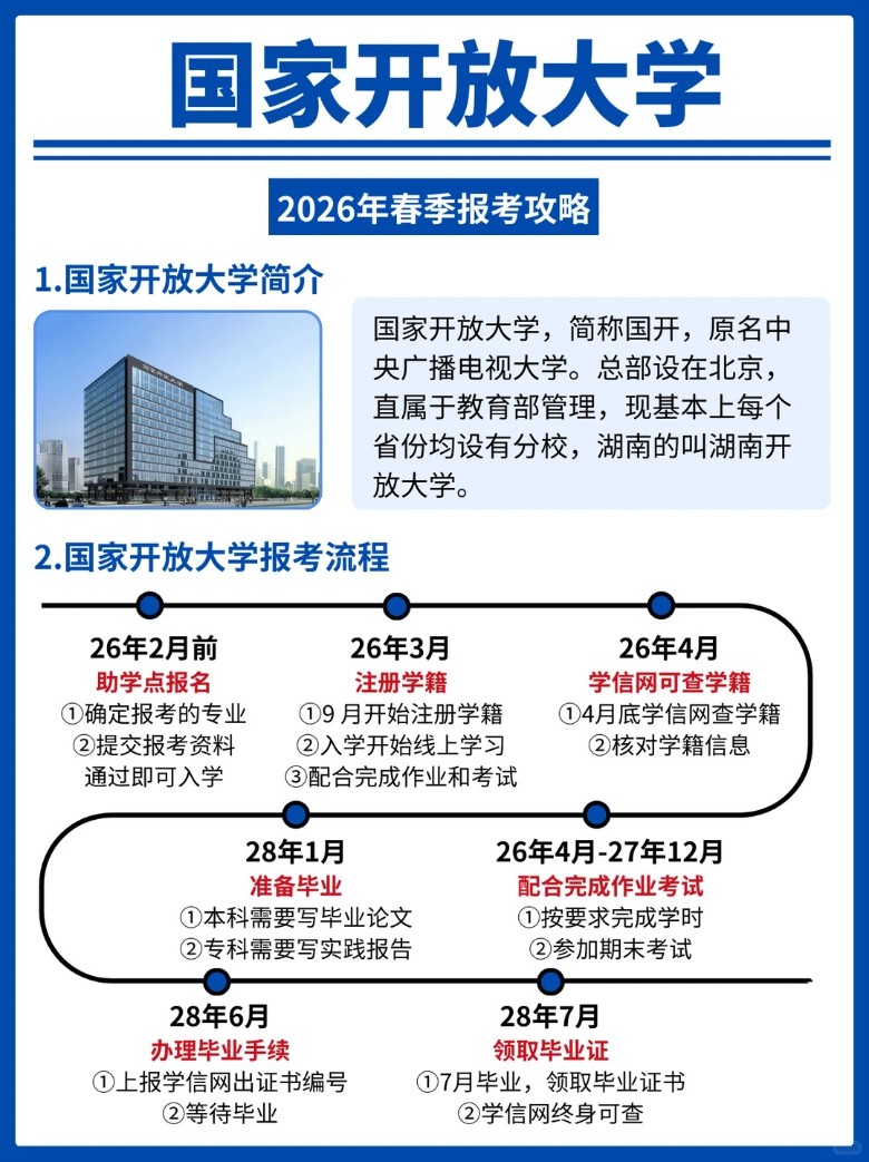 ✅ 层次学制:高起专、专升本均 2.5 年📅 报名时间:现在报名 春季 3 月入学;秋季9月份左右入学📋 材料:高起专(身份证 + 高中 / 中专毕业证);专升本(身份证 + 专科毕业证 + 学历备案表)先搞懂国开:原名中央广播电视大学,教育部直属,各省都有分校,学历学信网可查,在职党也能冲!📅国家开放大学报考时间线(划重点):▪️26年2月前:助学点报名,确定专业+交资料▪️26年3月:注册学籍,开始线上学习▪️26年4月:学信网查学籍,核对信息▪️26年4月-27年12月:完成作业和考试▪️28年1月:本科写论文/专科写实践报告▪️28年6月:办毕业手续▪️28年7月:领毕业证!🌟国家开放大学优势真的香:✔️免试入学,不用线下上课✔️在职可考,全程线上超省心✔️学历学信网终身可查🎓 专业:高起专有大数据与会计、机电一体化等近 20 个;专升本有计算机、数字媒体艺术等 30 + 个(含人工智能热门方向)🔍 条件:满 18 岁,专科需初 / 高 / 中专毕业证,本科需专科毕业证💻 学习:纯线上视频课,免试入学想提升的别犹豫,冲就完了!❓为什么要选开放大学?✅免试入学✅轻松报读✅学信网可查✅线上学习✅国家认可✅含金量高✅可考公考编,考研,评职称,考资格证等👫适合人群✅错过成考的同学,现在报国开春季,和今年成考毕业时间差不多✅在职党:没时间备考自考 / 成考✅宝妈:带娃没法出门学习✅基础弱:怕考高数英语,想免试入学✅急需学历:考公 / 评职称 / 考教资要快速拿证