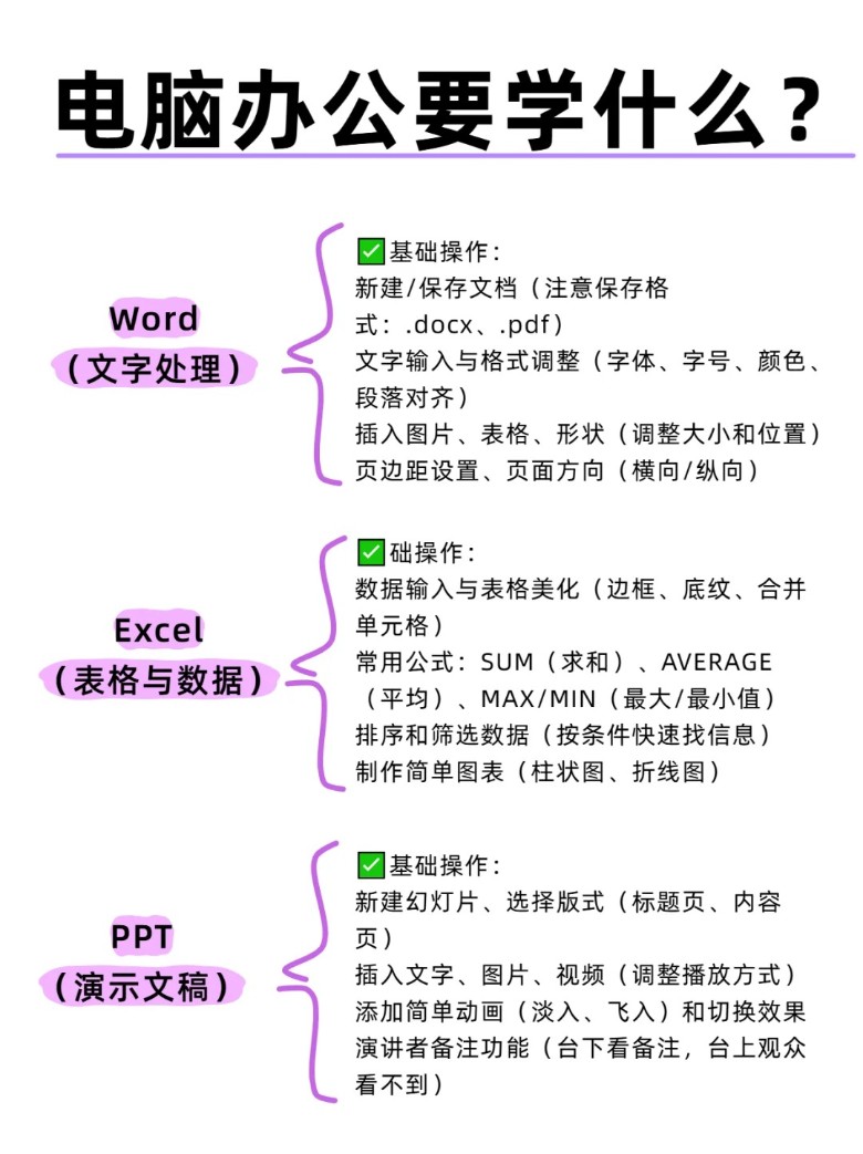 还在为不会电脑办公焦虑吗?不管是求职加分、职场晋升还是学业辅助,电脑办公技能都是刚需!整理了超全学习清单,从基础到进阶,新手也能快速拿捏~-🔹基础必备软件(重中之重!)✅ Microsoft Office 三件套Word:文档排版是核心!学会样式设置、目录生成、页眉页脚编辑,苏州很多企业文职岗笔试都考这个!简历排版、工作报告全靠它,建议多练真题案例。Excel:数据处理神器!基础的求和、筛选、排序必须会,进阶的 VLOOKUP 函数、数据透视表一定要掌握,财务、运营岗必备技能,苏州电商公司超看重这个能力。PowerPoint:演示文稿制作!别再只会套模板啦,动画逻辑、配色技巧、内容结构化很关键,汇报、答辩、商务展示都需要。-✅ WPS 办公套件很多苏州本土企业在用,操作和 Office 类似但更轻量化,云文档同步超方便,适合经常移动办公的宝子,免费功能基本能满足日常需求。-学会电脑办公真的能省超多时间!不管是应届生求职还是职场人提升,都是性价比超高的技能上课时间:周三、周五上午9:30-12:30周日:13:00-17:00学习周期 一个多月一对一学习、企业团体学习皆可。具体可以来校区现场了解。