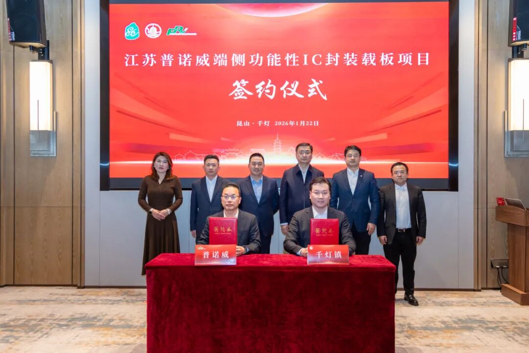 1月22日,江苏普诺威端侧功能性IC封装载板项目正式签约落户千灯镇。作为马年首个10亿元级重大产业项目,此次签约既是千灯镇深入贯彻党的二十届四中全会精神,落实市委全会、市两会部署的具体实践,更以“一马当先”的奋进姿态,吹响了新年招商引资与产业升级的冲锋号。昆山市副市长宋琦会见了江苏普诺威电子股份有限公司董事长马洪伟一行,并共同见证签约。千灯镇党委书记朱晓亮,镇党委副书记、镇长朱飞波及市级机关相关部门负责人出席活动。