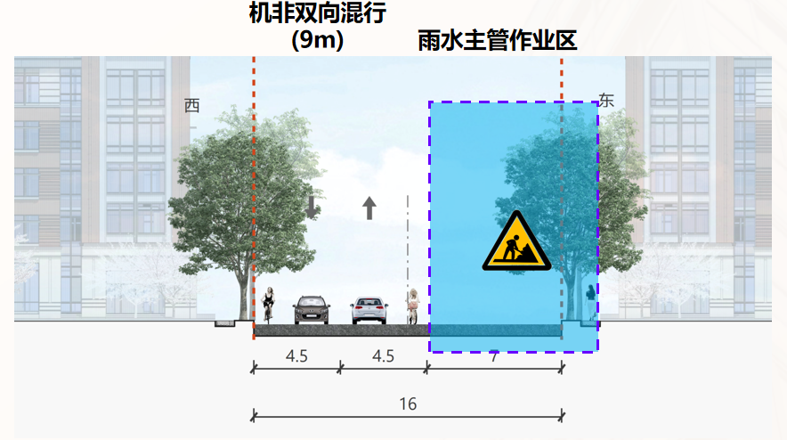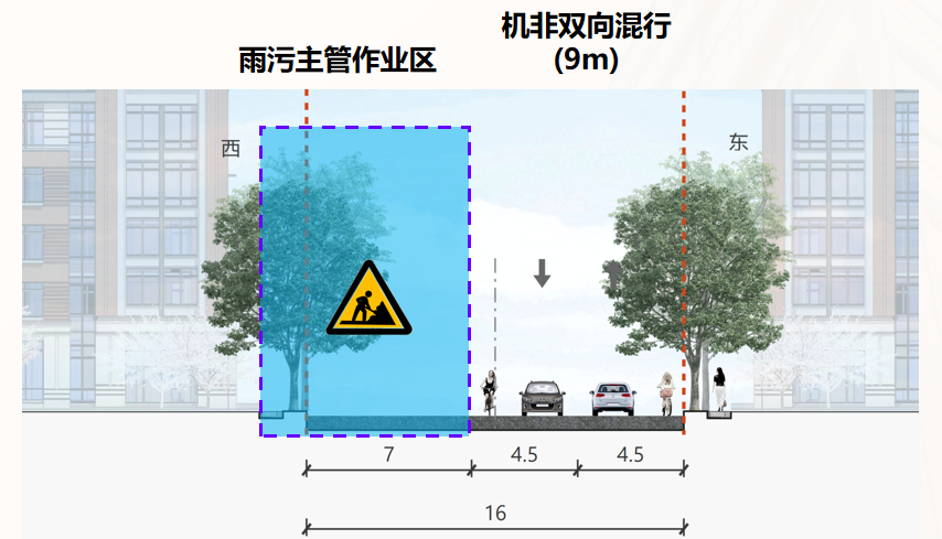 二阶段:东侧雨水施工,西侧双向机非混行。工期约2个月。