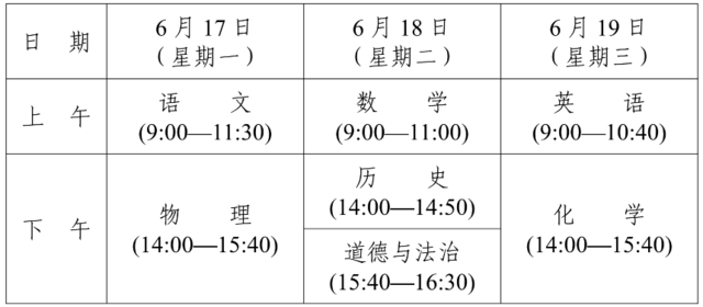 英语(书面考试)、物理、化学均为100分钟;道德与法治及历史为100分钟,其中道德与法治部分和历史部分各50分钟。