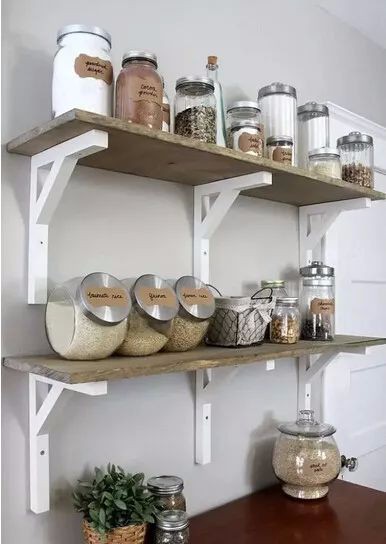 台面想要建议大家少放东西,这样做饭之后比较好打扫。一定要放的话可以准备好类似图中的铁艺架子和长条形木质收纳架,方面整体转移打扫。