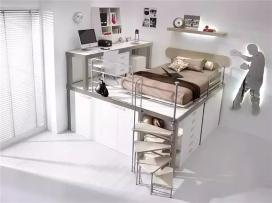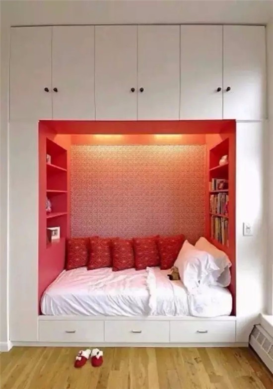 小户型最不可避免的一个问题就是收纳空间的不足,随着我们住的时间变长,东西只会越来越多,很多东西虽然用不上了,但还想着留下来做个纪念,所以很多没有考虑到的地方,都可以用上做收纳,今天要介绍的床,卧室里多一个收纳床,空间就能宽敞个5平方以上! 说到收纳床,相信大家第一个想到的就是榻榻米,定制一个榻榻米地台,把卧室空余的空间全都用上,收纳空间是最多的。 但我们也可以直接选择成品的箱体床,底下同样是抽屉、柜子,价格会比榻榻米低一些,比起普通床,肯定是会更贵的。 或者直接用旧抽屉改个收纳盒,装上几个轮字,然后放在床底下,用来放袜子之类的小东西还是比较不错的。 还有一种比较流行的设计,是在床底下留出几个空格,然后用来摆放书籍、小物件,显得更加的逼格满满。 最推荐的还是这种,把卧室里的床的位置抬高一些,这样底下就有很多的空间可以改成柜子、抽屉,用来收纳了。 如果层高足够,完全可以把衣柜、书房等和床结合在一起,把床放在高处,底下全都是收纳空间,这样做至少需要2.8米左右的层高,才不会太过压抑。 也有许多业主选择了把床给整个包围住的设计,如上图所示,营造一个私密的睡眠空间,有人觉得压抑,有人感觉更有安全感,我就觉得这样设计挺好的。 儿童房的高低床同样也可以把底部的空间用在收纳上,还有很多是把楼梯也改成了收纳的梯子,实用性非常强。 看了以上这么多种的收纳床设计,你们是否打算给自己的小户型卧室,装一个收纳床呢?建议大家可以尝试一些榻榻米和全包围式的设计,这样的做法都不需要浪费很多的空间,但是收纳的空间却是最多的!
