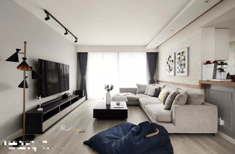 沙发背景墙展示了它十足的收纳与展示功能,弥补电视柜收纳不足的情况。▼