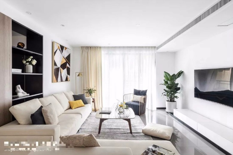 整面沙发背景墙安静简洁,局部点缀绿意植栽,营造出自然休闲气息。▼