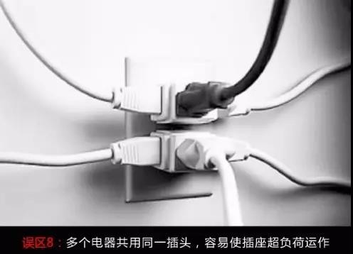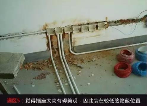 ▲误区5:安装插座时,觉得太高不方便使用,且有碍美观,便将插座装在较低的隐蔽位置。其实这样很容易让水溅到插座里,从而导致漏电。因此,明装插座距地面最好不低于1.8m,暗装插座距地面不要低于0.3m。厨房和卫生间的插座应距地面1.5m以上,空调的插座至少要2m以上。