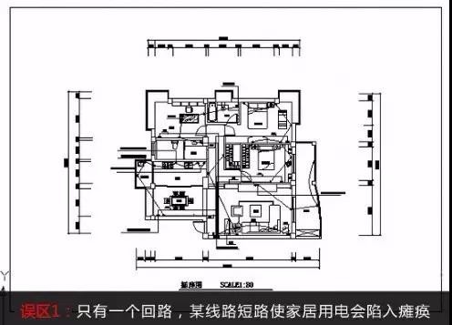 ▲误区1:不少老房存在家里只有一个回路的现象,任何线路短路,全屋用电会陷入瘫痪。值得留心的是,目前市面上的电线管长度≈(配电箱分别到每个房间进线端的墙面距离+各个房间内进线端至各开关插座的墙面距离)×108% 当然了,这是监理在审预算和计算工程量时常用的一则公式,指在配电箱没有移位的情况下适用。