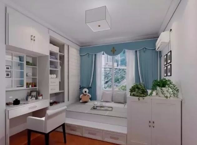 靠墙两面全设计成储物柜,热爱阅读的你再也不担心不够地方摆放自己心爱的书籍了,还能收纳其他不常用的物品呢! 旁边连着书桌,搭配多功能储物柜以及榻榻米,“麻雀虽小,五脏俱全”,书房的功能都完整地实现了!