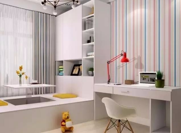 简单的台面沿着墙面延伸开来,可满足多人同时办公,储物柜也能满足收纳的需求,边上设置榻榻米,工作累了可以休息,客人来了也充分可以充当客房,一房多用,超实在!