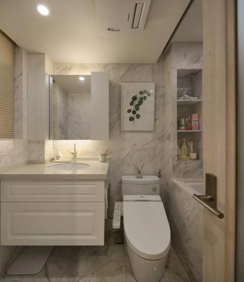 壁龛、隔板等都是卫生间收纳的好帮手,特别是卫生间经常会有一些凹凸平面,比如包水管的墙面会凸出,比如壁挂马桶背后水箱会有平台等等,这些凹凸平面不要浪费,正是设计壁龛或者隔板的好地方。