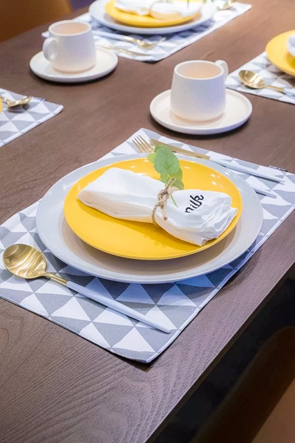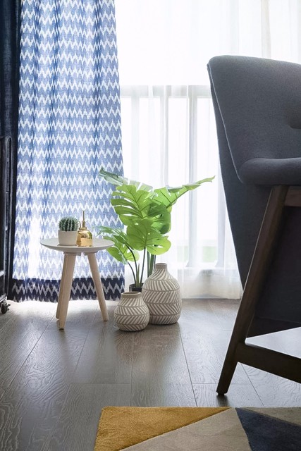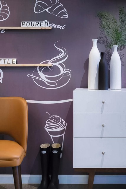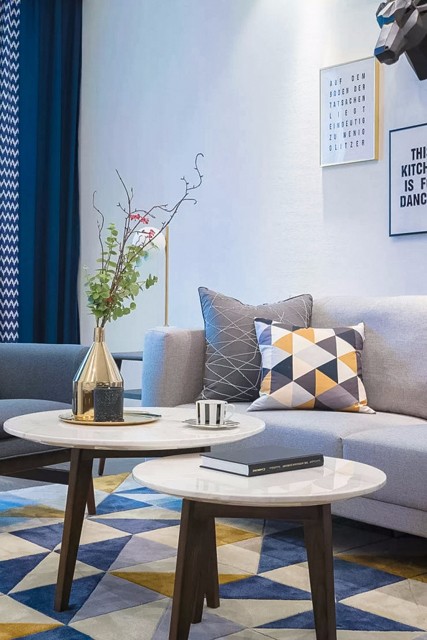 通透的采光加上清新的配色,阳光随意撒入客厅,舒适惬意,营造温暖的待客环境。沙发背景墙上的黑色麋鹿头是客厅的一大亮点,搭配白色的墙面,就像穿行在北欧迷雾丛林里的小鹿走出了森林,看见了蓝天白云。是的,昨天今天明天,既是装饰墙面的饰品,也是主人所表达的人生格言:昨天已是过去,而明天是未知的,只有今天才是当下,用不同的字体突出珍惜今天,活在当下。众里寻他千百度,蓦然回首,那人却在灯火阑珊处。嫩绿的龟背竹,配上艺术感十足的陶瓷,在白色的纱帘下,微风轻轻,阳光淡淡,多么美好的一幅画。灰色的布艺沙发,搭配高矮的实木茶几,金色花瓶里蓬勃生长的绿植,温馨惬意的待客空间被勾勒出来,几何的地毯和同样元素的抱枕,个性十足。餐厅