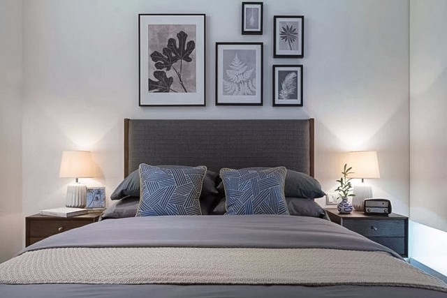 白色的餐边柜上用白色杯子黑色字体拼成的“SODEGREEN”,主人是打粉的属性暴露无遗,“这是一首简单的小情歌~”。精致的碗筷摆放,凸显着餐厅的韵味。 主卧