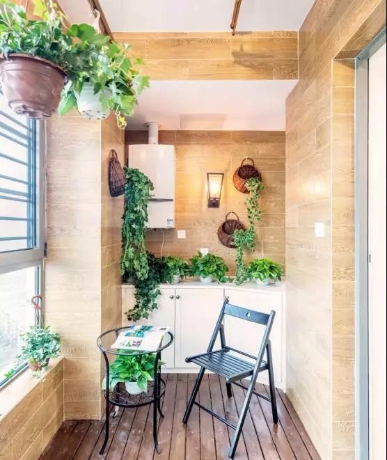 仔细看看,其实也没占多大地啊,就是在阳台两边设计小座椅和摆放些绿植。桑拿板做的吊顶,再装上防腐木的网格置物架,挂上些小花盆什么的,又简单又好看。