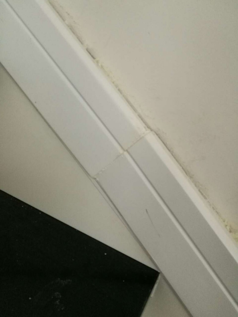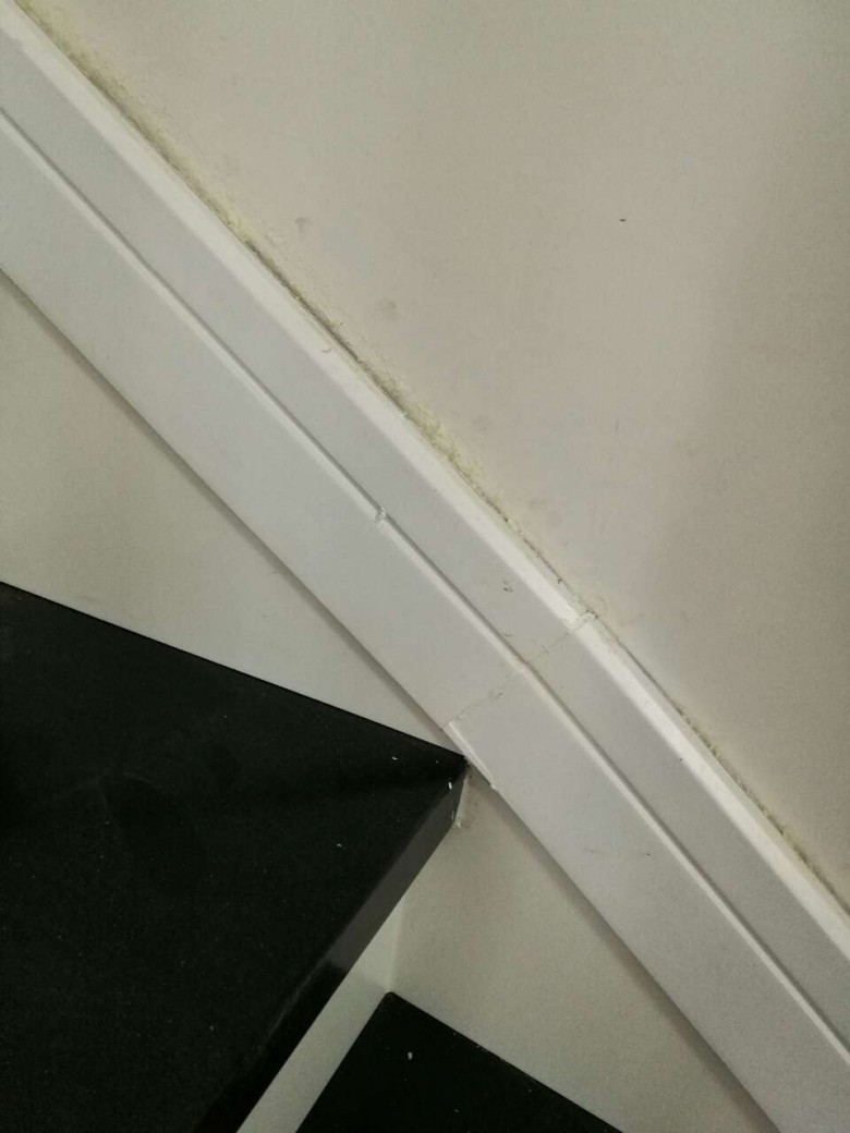 然后说踢脚线,这楼梯是原来楼梯没有拆,锯掉了边,然后新的直接盖在旧板上,原来踢脚线是多层板现场贴的,因为是弧形楼梯嘛,签合同时老板说拆了后面也拿多层板做肯定没问题,我还提醒他不好拆,因为踢脚线是被楼梯板盖住的。后来他好不容易拆了踢脚线,因为自己拉的屎怎么也要吃完啊,说踢脚线他做不了,为此我老公差点和他干架,你拆完了说做不了,那让我们怎么弄,之前为什么不说?不管三七二十一先把单接了吗?最后他说给他留好实木踢脚线,他来安装。安装结果就是这个熊样了。照片已经是美容师美过之后拍的了。美容师说没法更美了,因为装得太烂了。这个安老板装成这个样催我付尾款,我让他弄好,他说踢脚线他不管,本来他就没说要装,是我们逼着他做的,尼玛合同里还写着踢脚线呢,最后谈崩了他说要去把楼梯拆了,真是呵呵。最后他找了个美容师,美完就这样罗,反正我们钱也付完了。
