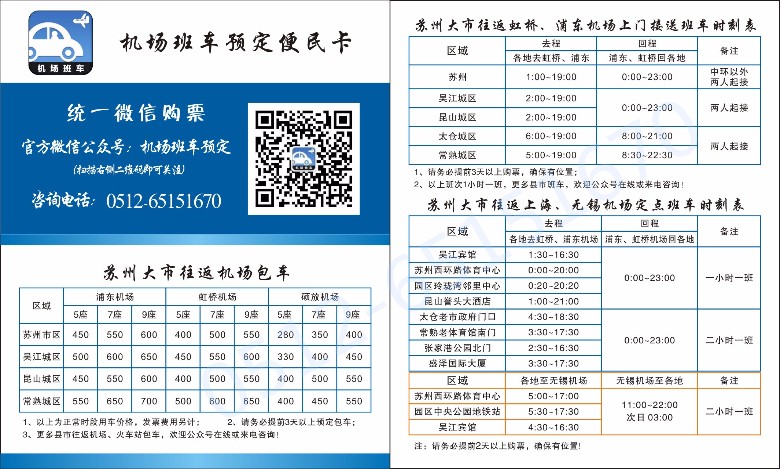 昆山往返上海虹桥、浦东机场班车时刻表便民卡,每小时一班,天天发车!扫描下方二维码关注公众号,在线咨询和购票!