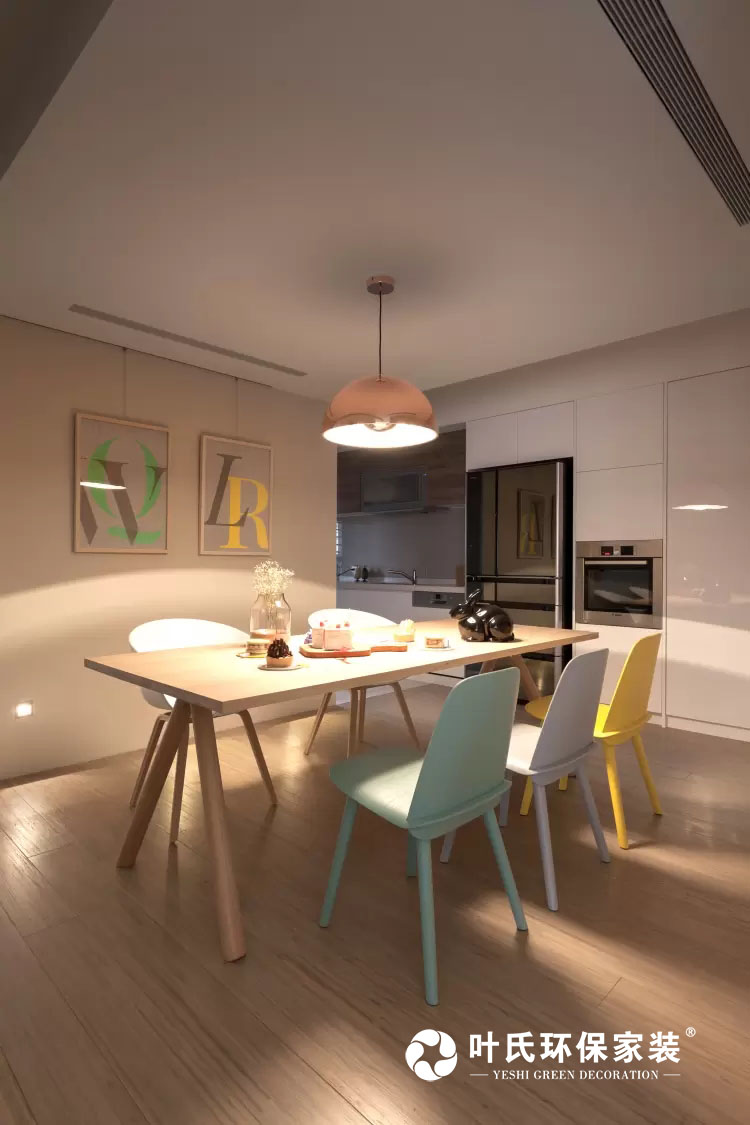 餐厅周边空间宽阔,淡雅的空间色彩赋予餐厅素朴的格调,一盏金色分子灯,营造温馨的就餐环境。为了避免空旷,餐桌旁的意境画进行了点缀作用。