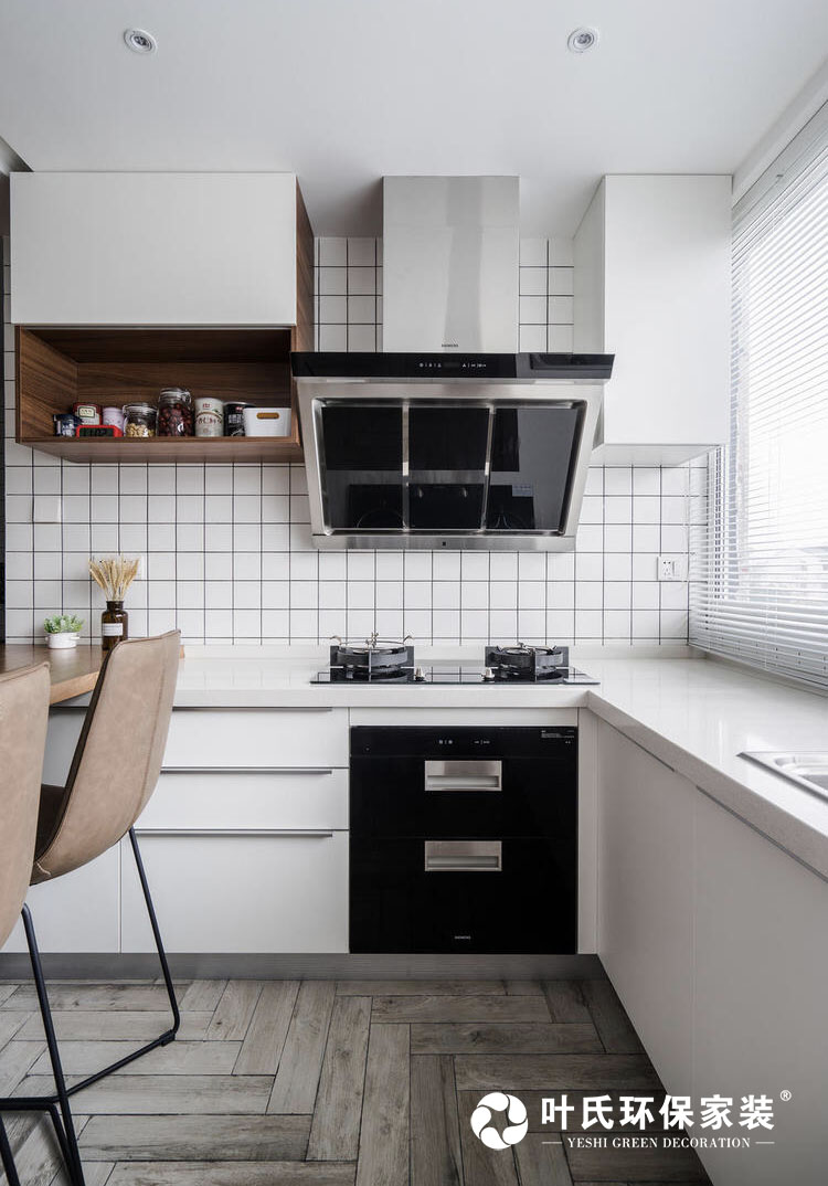 厨房移门采用黑色边框,与原木色相映衬显得简洁大方。