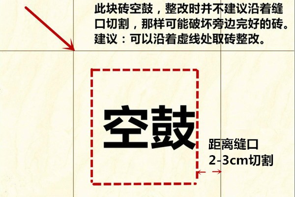 1、取下瓷砖:用切割机在空鼓瓷砖距缝口2-3cm处进行切割,然后再用小锤子清理剩余的瓷砖。取瓷砖时一定不要暴利拆除,这样可能扩大空鼓的范围。
