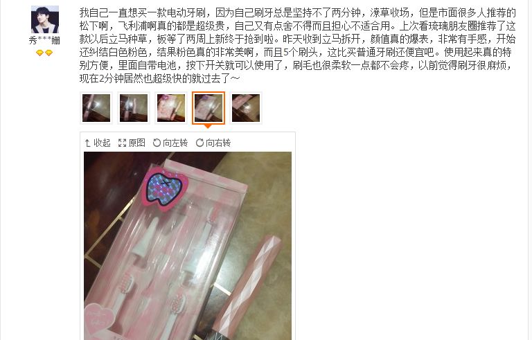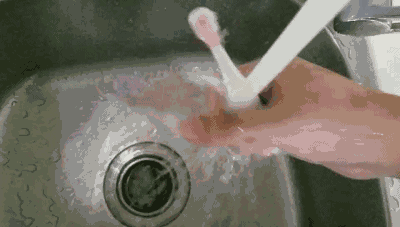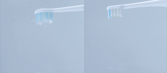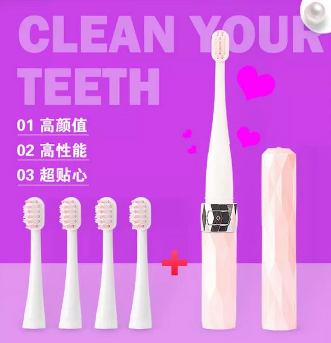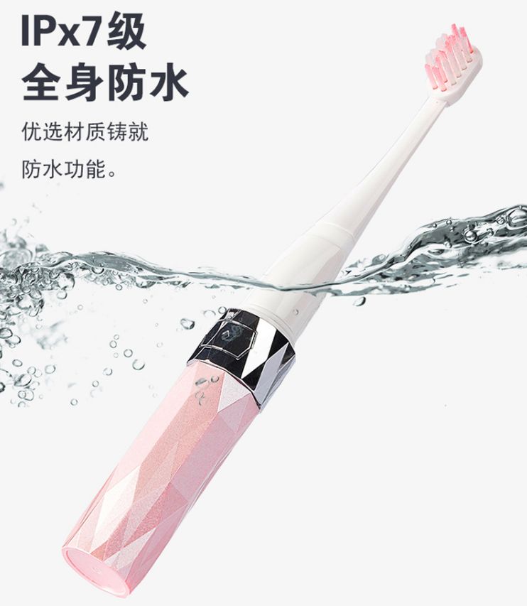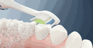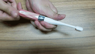 2、将刷毛以小角度对准牙龈线或放在牙齿上,接中间的开关按钮,打开声波震动,使用时,亲们可以稍微施加一点点力来更好地发挥电动牙刷的作用(力度为普通牙刷的1/6左右)可轻轻的将刷头在牙齿间缓慢移动,让刷毛能够清洁到牙缝刷完后,请先按中间的开关按钮,关闭声波震动,等刷头较干时盖上外盖即可。