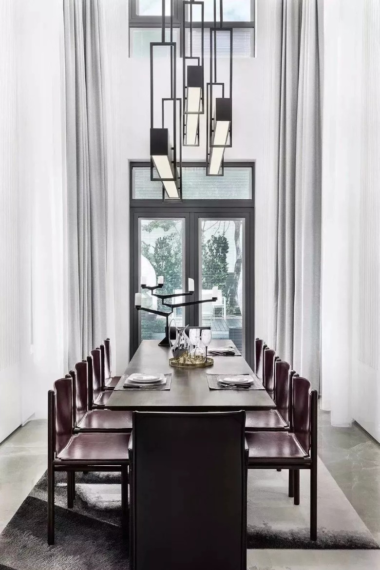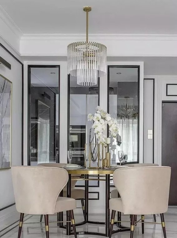 轻奢风格的配色,偏爱一些清新淡雅的蓝色、灰色或是绿色,所以在轻奢软装搭配上就不要选择那些色彩比较浓烈鲜艳的布艺沙发,餐桌和餐椅表面略带雕花,配合扶手和椅腿的弧形曲度,显得优雅矜贵,而在白色的卷草纹窗帘、水晶吊灯、落地灯、瓶插百合花的搭配下,浪漫清新之感扑面而来。