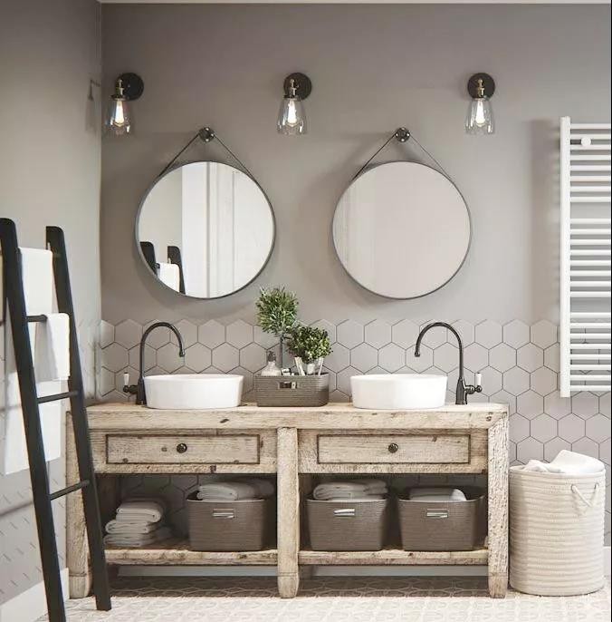 悬挂圆镜以及蜂窝状的六边形瓷砖墙搭配在一起,