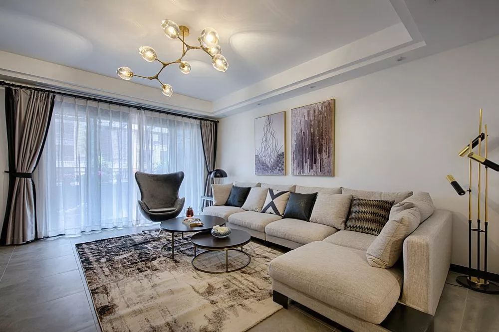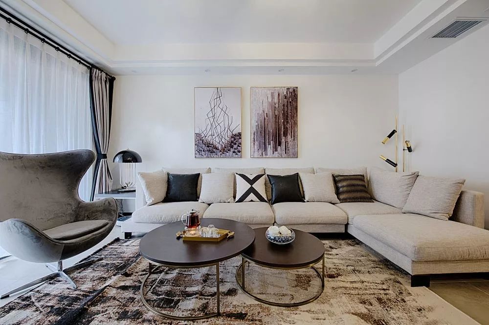 ▲ 客厅色调主要以黑白灰为主,简约时尚。电视背景墙没有过多繁杂的装饰,质感满满的黑色落地电视柜大气又低调。