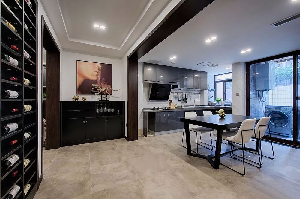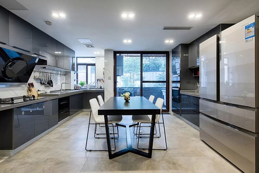 ▲ 餐厨一体的设计,风格延续客厅的黑白灰,在线条处理上更加简洁利落。阳台处采用了玻璃推拉门,增加视觉面积的同时,也为餐厨带来了绝佳的采光。