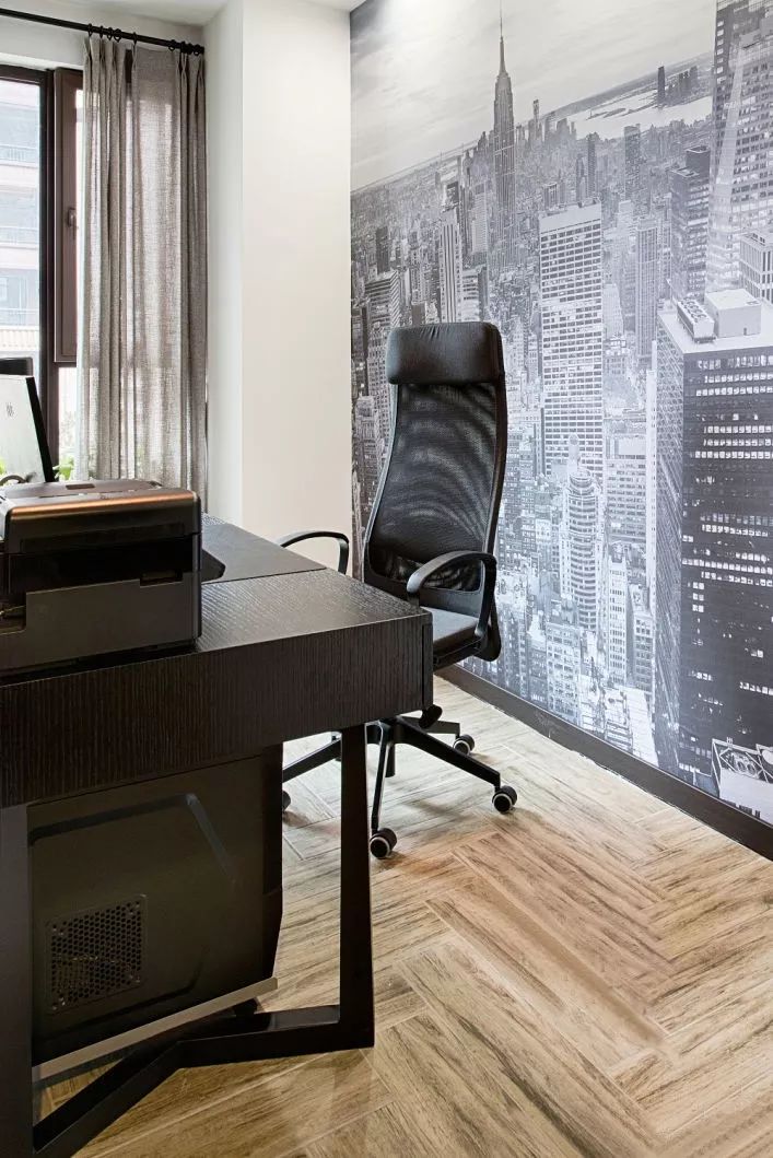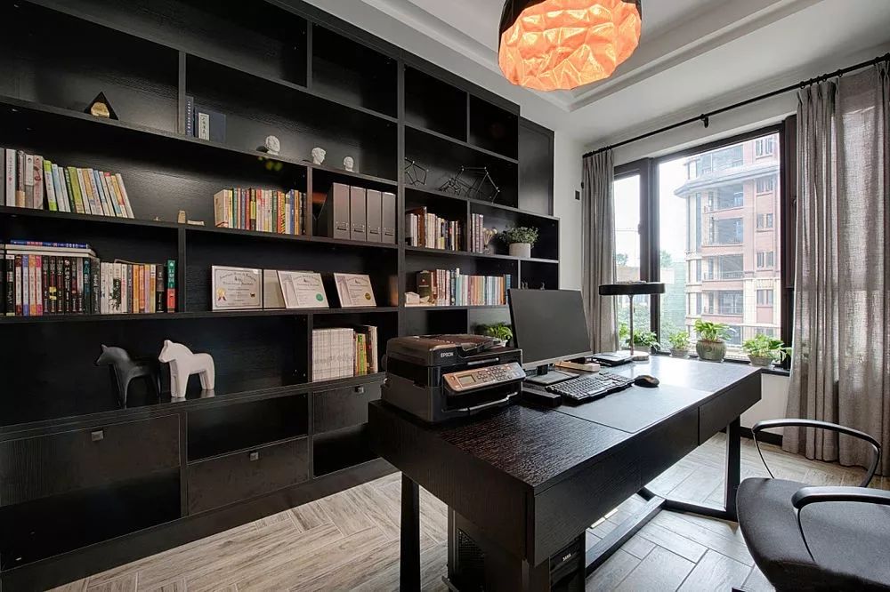 ▲ 书房自然少不了大面积的书架,无论是主人珍藏的书籍,还是形色各异的装饰品,都在这没有一丁点杂质的黑色书架上,绽放着自己的光彩。