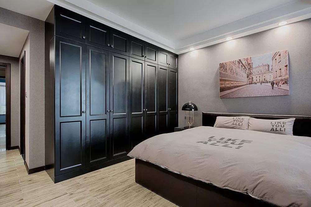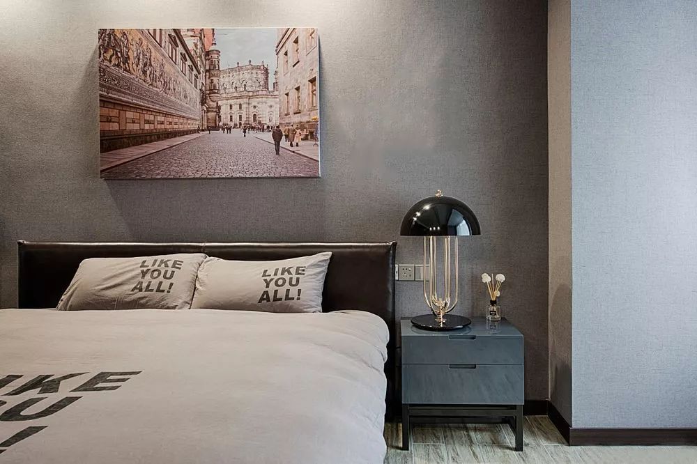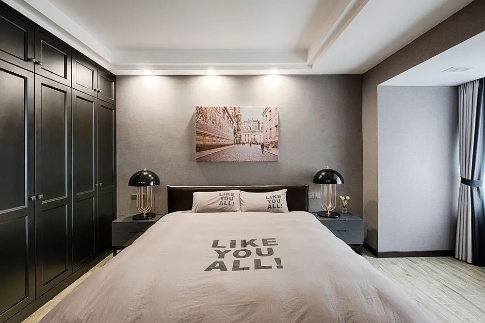 ▲ 卧室加入了粉色系的床品与墙画,使黑白灰营造出的性冷淡气息不再那么赤裸裸,顶天立地式的大衣柜,充分满足衣物收纳需求。