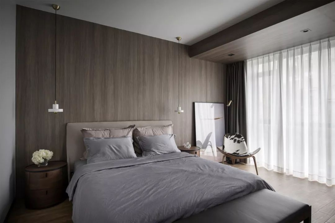 主卧空间,延续客厅的设计元素,铺叙宁静优雅的睡眠调性。木饰面床头背景,让空间更加简约自然,朴实的色彩营造出大气而质感的空间。主卧室里的书房一角,放弃普通布艺窗帘,用多面百叶窗作为此空间的重要装饰,拥有着绝佳的采光视野。