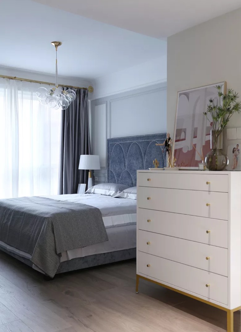 主家房子,户型方正还算满意,所以墙体结构和水电没有大改,但其它方面可以说是改头换面。 1、墙面重新刷漆,增加了美式的墙板造型,原有的灯具全部换掉。2、全屋做了很多衣柜,并且都是隐形柜的设计。另外榻榻米、地台、梳妆台也都是现场制作的,在保证做工的同时相对来说节省了开销。3、原本的地板是很普通的暗红色地板,换成了更显年轻感的中性色地板,这样一来原始的老气感立马消散。4、换掉了原本的棕色房门,改成了有线条感却又稍简洁的轻美式门。后来发现,和现场制作的墙板和柜门实在太搭了。